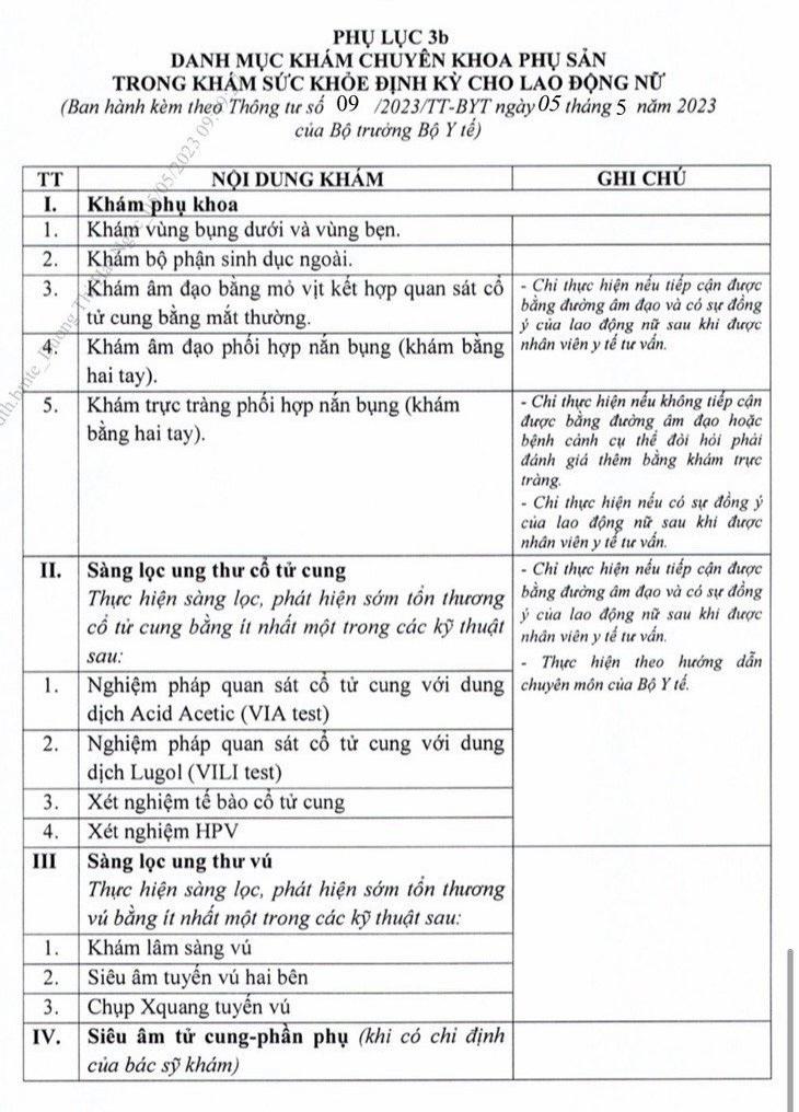 Theo Phụ lục 3b, lao động nữ khi khám sức khỏe định kỳ được khám chuyên khoa phụ sản, gồm 4 nội dung: