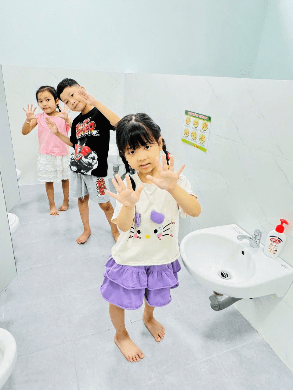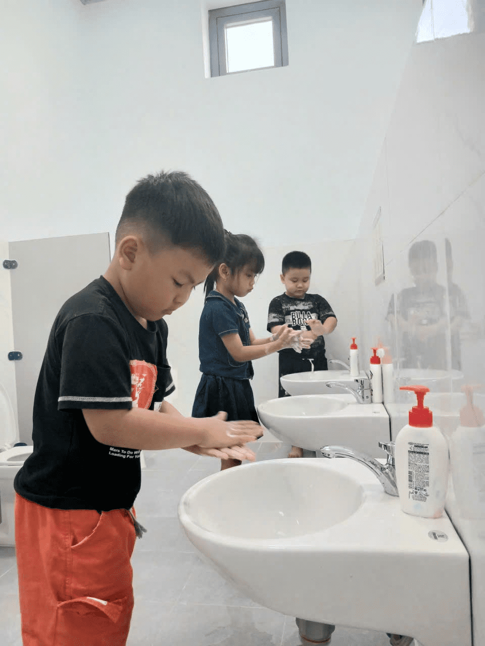 Các giáo viên luôn hỗ trợ trẻ rửa tay và dạy trẻ rửa tay với xà phòng vào các thời điểm: khi vào lớp, sau khi vui chơi, trước khi ăn, sau khi vệ sinh và khi về đến nhà; nhắc nhở trẻ không đưa đồ chơi vào miệng, không mút tay, không cắn móng tay; dặn dò trẻ khi nào thấy mệt thì nói/thông báo ngay cho cô giáo. Giáo viên sẽ liên hệ ngay với phụ huynh để đưa trẻ về và đi khám ở các cơ quan y tế. Khi có chẩn đoán của bác sĩ, xác định trẻ đã nhiễm bệnh, nhà trường đề nghị phụ huynh cho bé nghỉ học theo thời gian quy định.