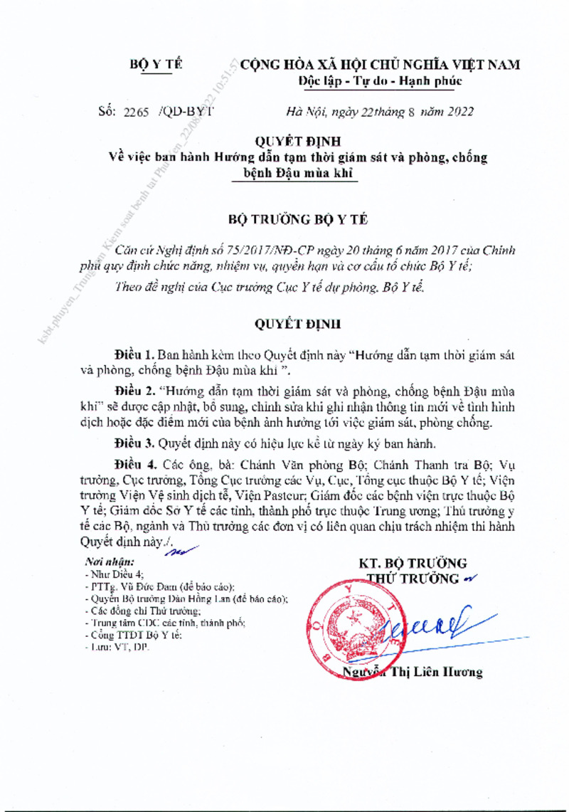| Tiêu đề văn bản | Về việc ban hành Hướng dẫn tạm thời giám sát và phòng, chống bệnh Đậu mùa khỉ | ||