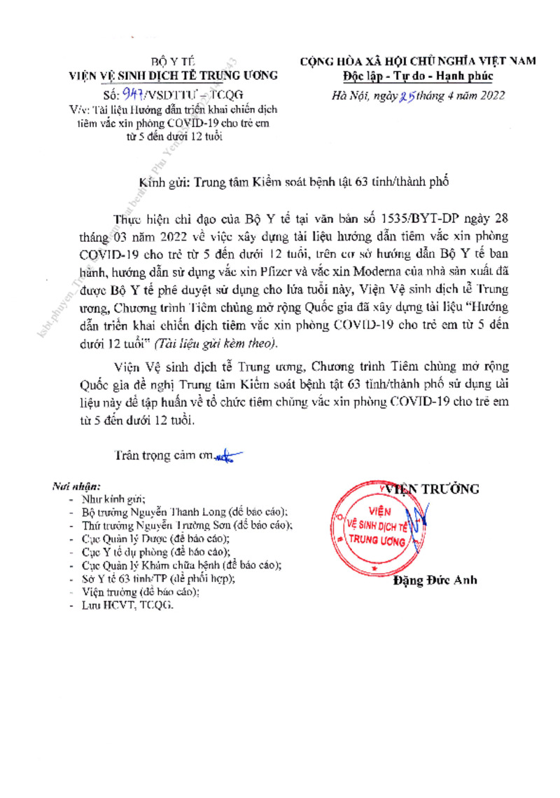 | Tiêu đề văn bản | Tài liệu hướng dẫn triển khai chiến dịch tiêm vắc xin phòng COVID-19 cho trẻ em từ 5 đến dưới 12 tuổi | ||