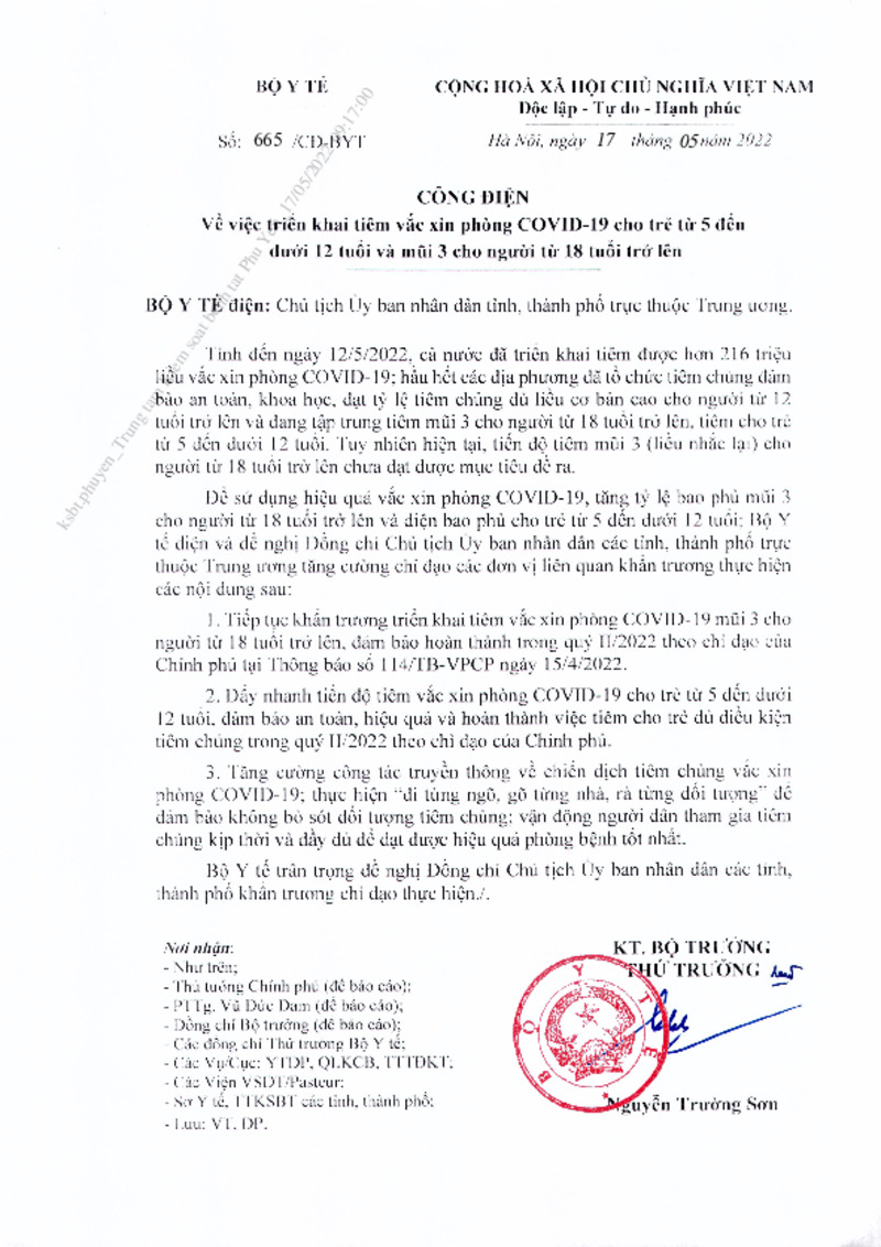 | Tiêu đề văn bản | Công điện về việc triển khai tiêm vaccine phòng COVID-19 cho trẻ từ 5- dưới 12 tuổi và tiêm mũi 3 cho người trên 18 tuổi | ||