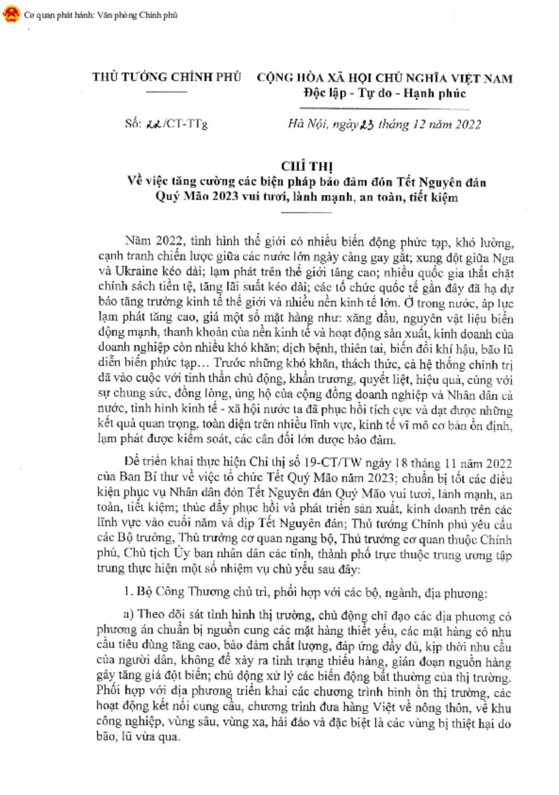 | Tiêu đề văn bản | V/v triển khai Chỉ thị của Thủ tướng Chính phủ về tăng cường các biện pháp bảo đảm đón tết Nguyên đán Quý Mão 2023 vui tươi, lành mạnh, an toàn, tiết kiệm | ||